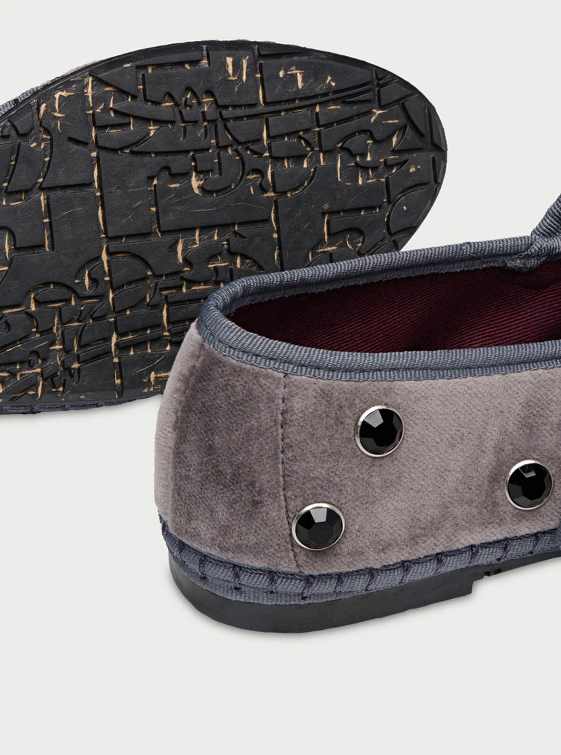 - Bailarina de terciopelo con abertura en “V” en gris con ribete gris y tachuelas de cristal gris.