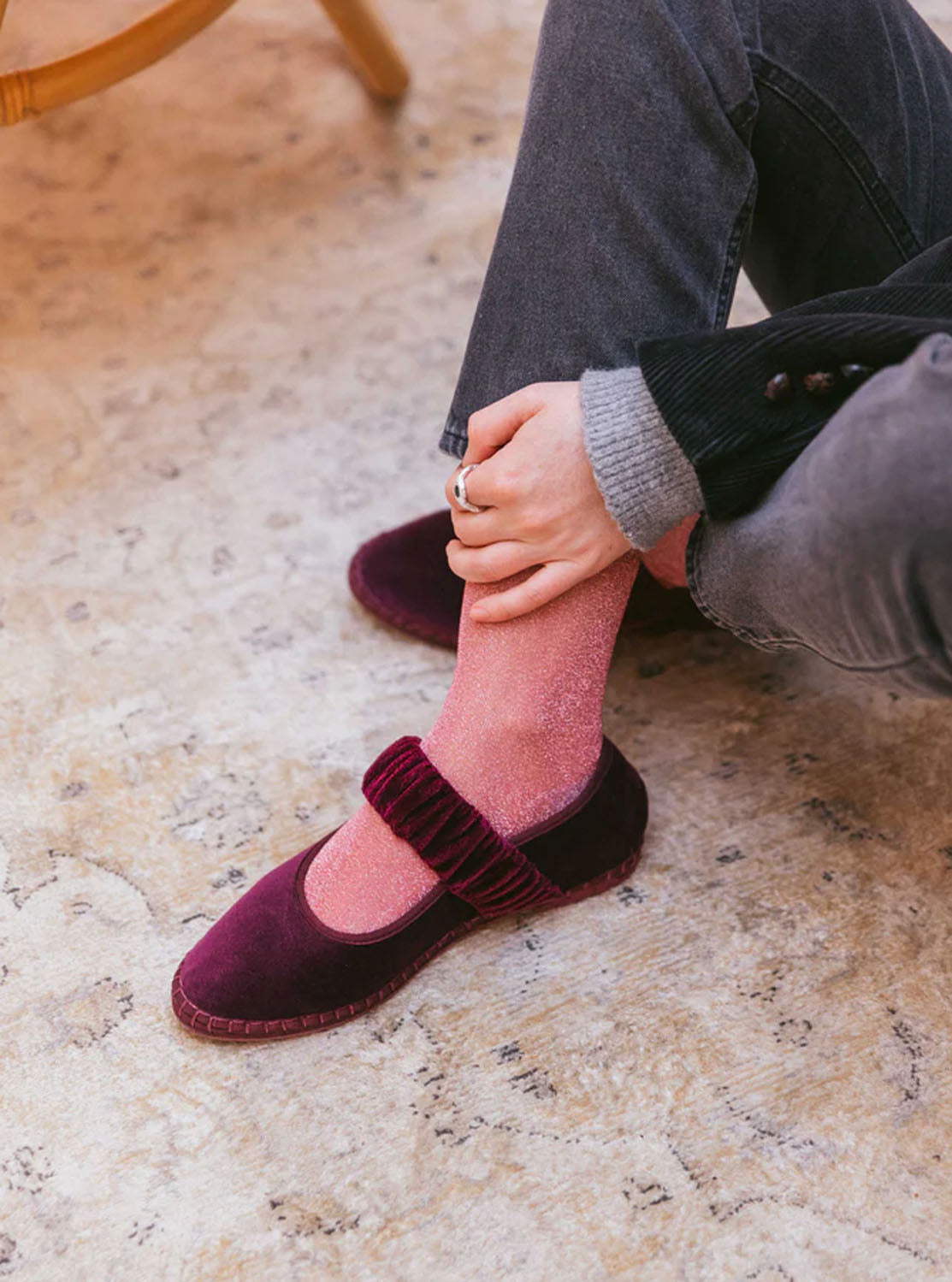 - Mafalda de terciopelo en color burdeos oscuro con ribetes en color burdeos oscuro y elástico de terciopelo en color burdeos oscuro.