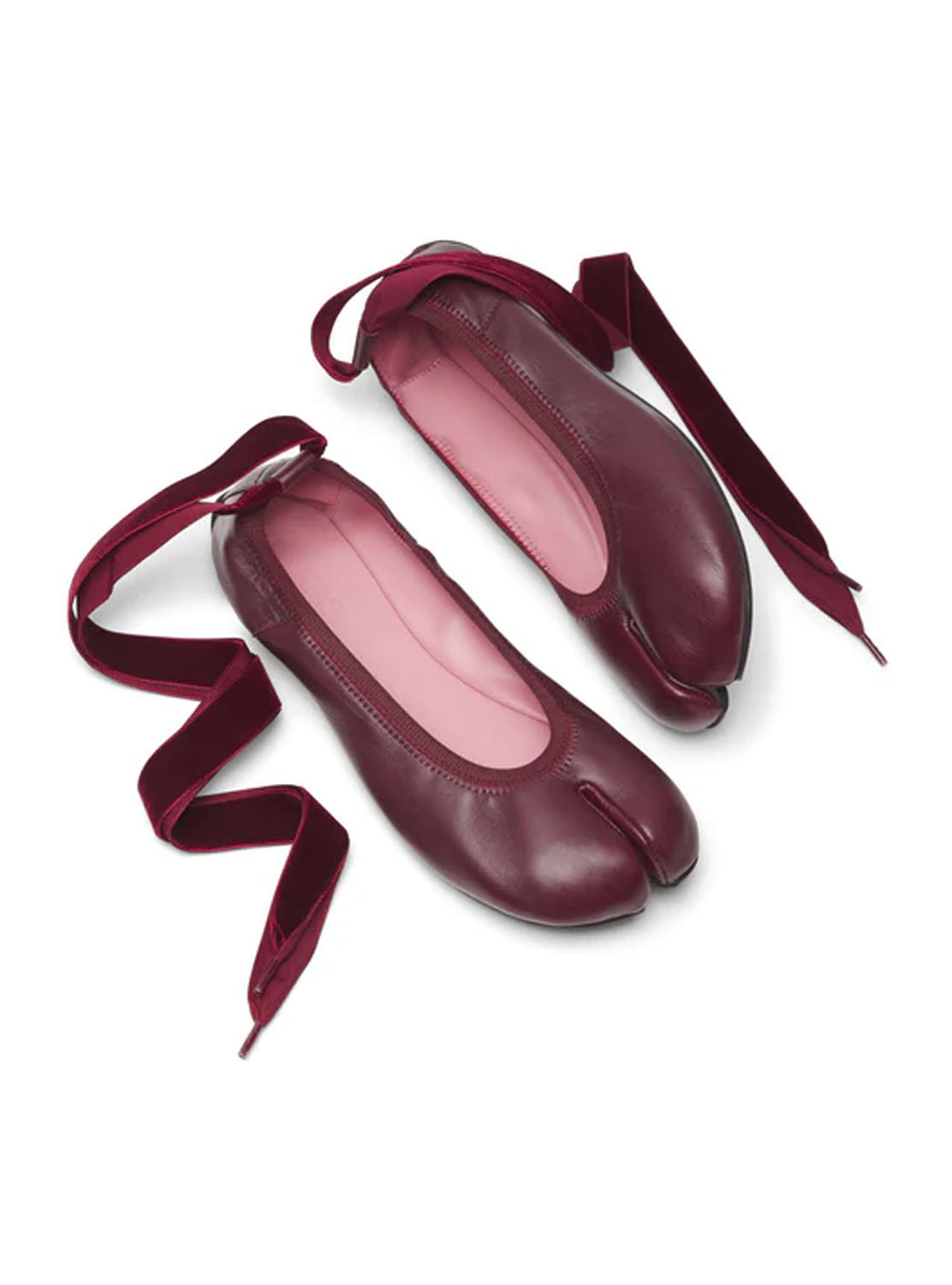 Fabricadas artesanalmente en piel de cabrito, cuentan con un diseño estilo tabi y una suela flexible de 2 mm que ayuda a fortaceler el pie de forma natural. Incluyen cintas de terciopelo para un ajuste personalizado.