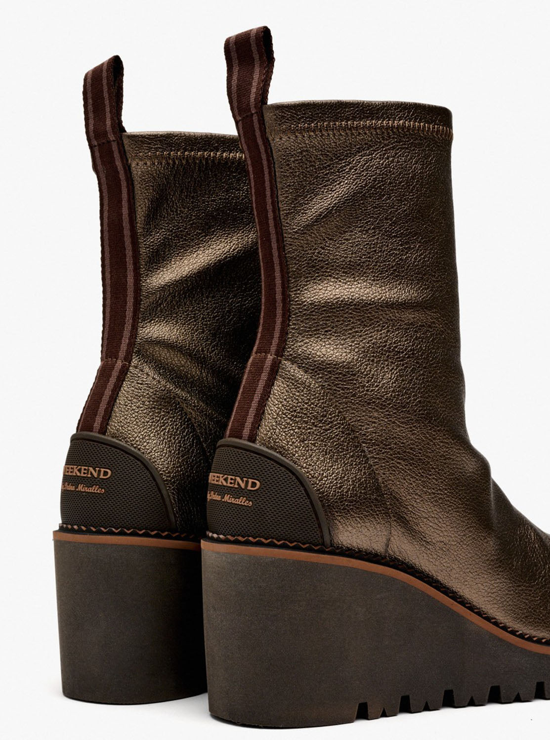 Botines de tejido elástico efecto piel metalizada de color bronce. Estos botines combinan comodidad y estilo gracias a su tejido elástico, que imita la textura de la piel. La parte superior flexible ofrece un ajuste perfecto. La suela de cuña añade altura a la vez que garantiza la estabilidad y la comodidad.