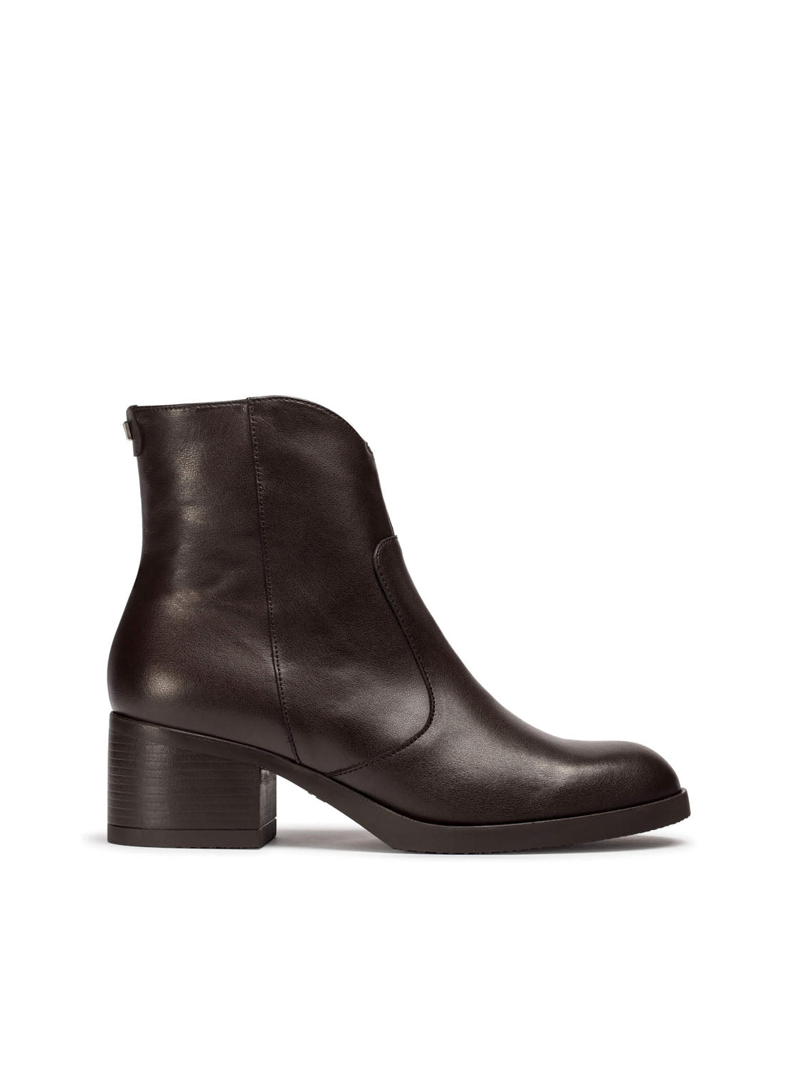 Botines SANTAFÉ 53 fabricados en piel lisa marrón. Este modelo, de líneas depuradas y silueta envolvente, apuesta por una estética versátil y atemporal. La caña a media altura incorpora cremallera lateral para un calce rápido y cómodo. La suela robusta con tacón ancho y la plantilla interior MemoryGel aseguran un confort absoluto durante todo el día.