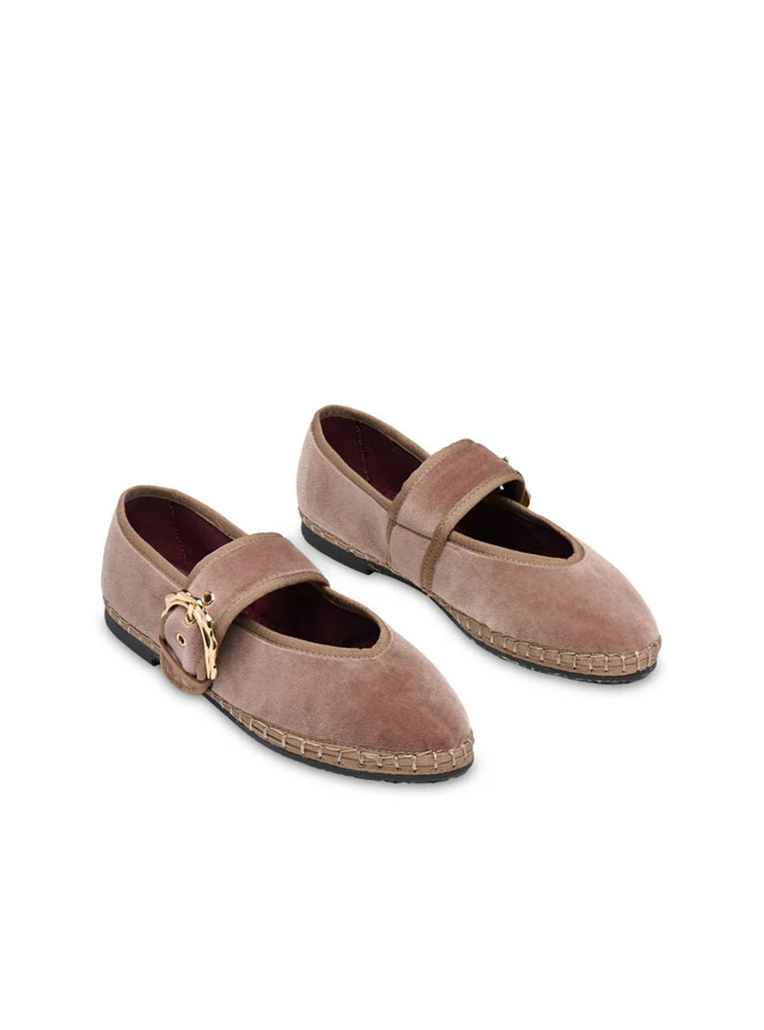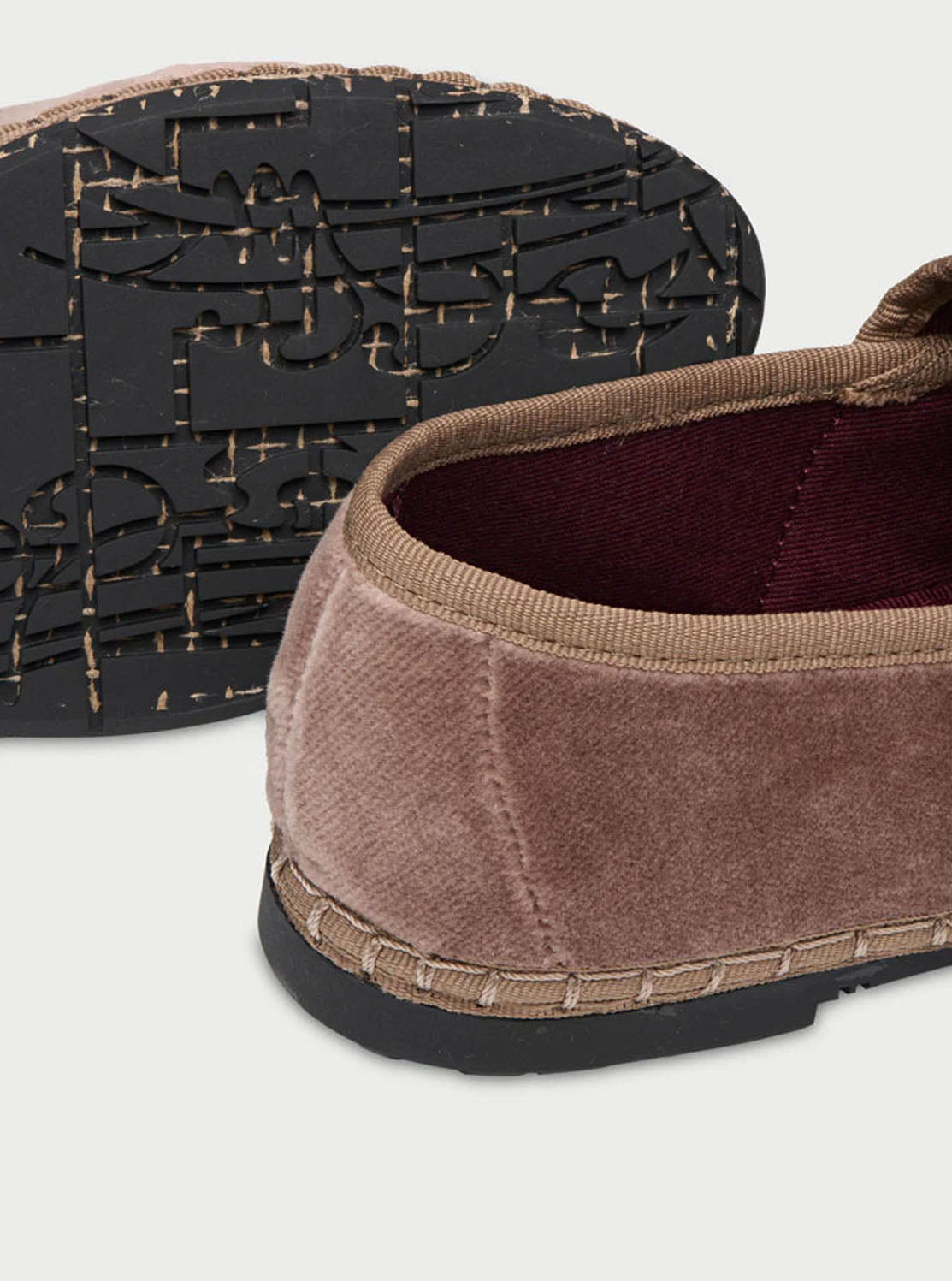 Mary jane de terciopelo en marrón claro con ribete marrón claro y cierre de hebilla. El exterior del zapato es 100% terciopelo de algodón y el interior 100% algodón orgánico con tratamiento antibacteriano.