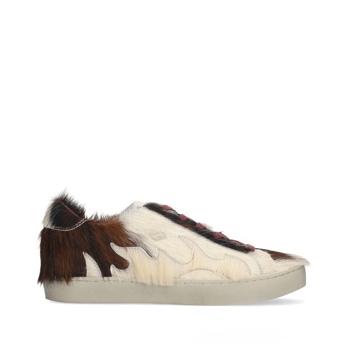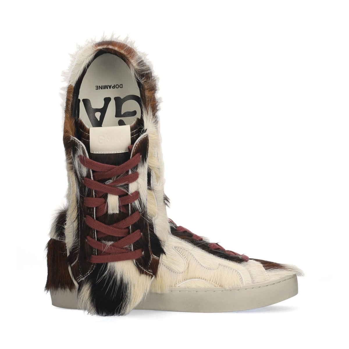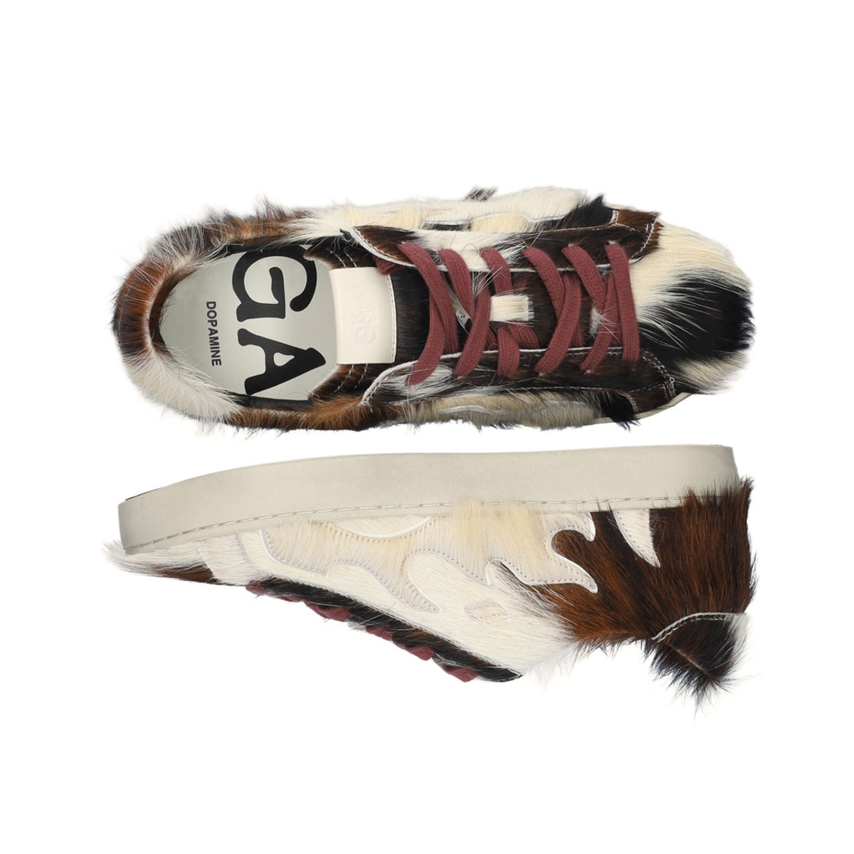 Deportivos modelo dopamine fafricadas con un acabado en pelo con estampado de vaca. Cordones contrastados