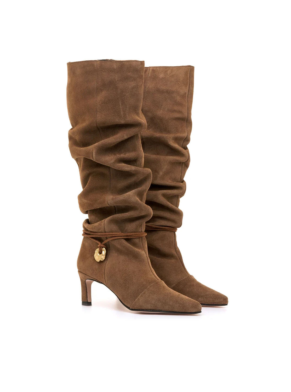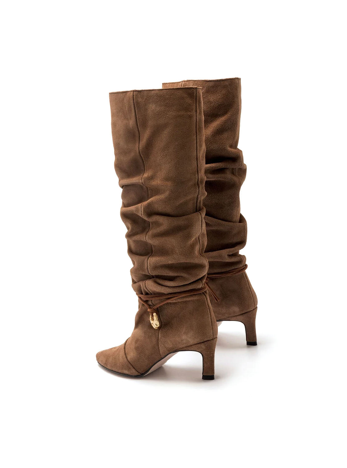 Bota alta para mujer de serraje de color visón de la marca Mustang, modelo Gala, diseñada en colaboración con la influencer Marta Lozano. Este modelo destaca por su diseño slouchy con caña arrugada, puntera afilada y tacón fino que estiliza la silueta. El detalle del cordón fino con aplique dorado artesanal alrededor del tobillo añade un toque distintivo. Pensada para quienes buscan un calzado con personalidad, esta bota ofrece una combinación equilibrada entre tendencia y confort para llevar tanto en el día a día como en ocasiones especiales. Fabricadas en España.