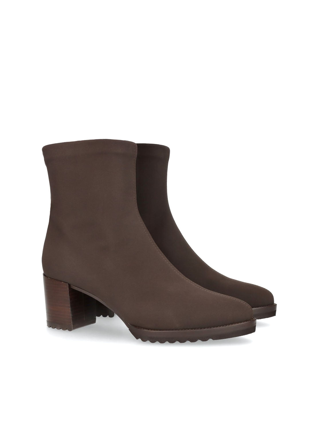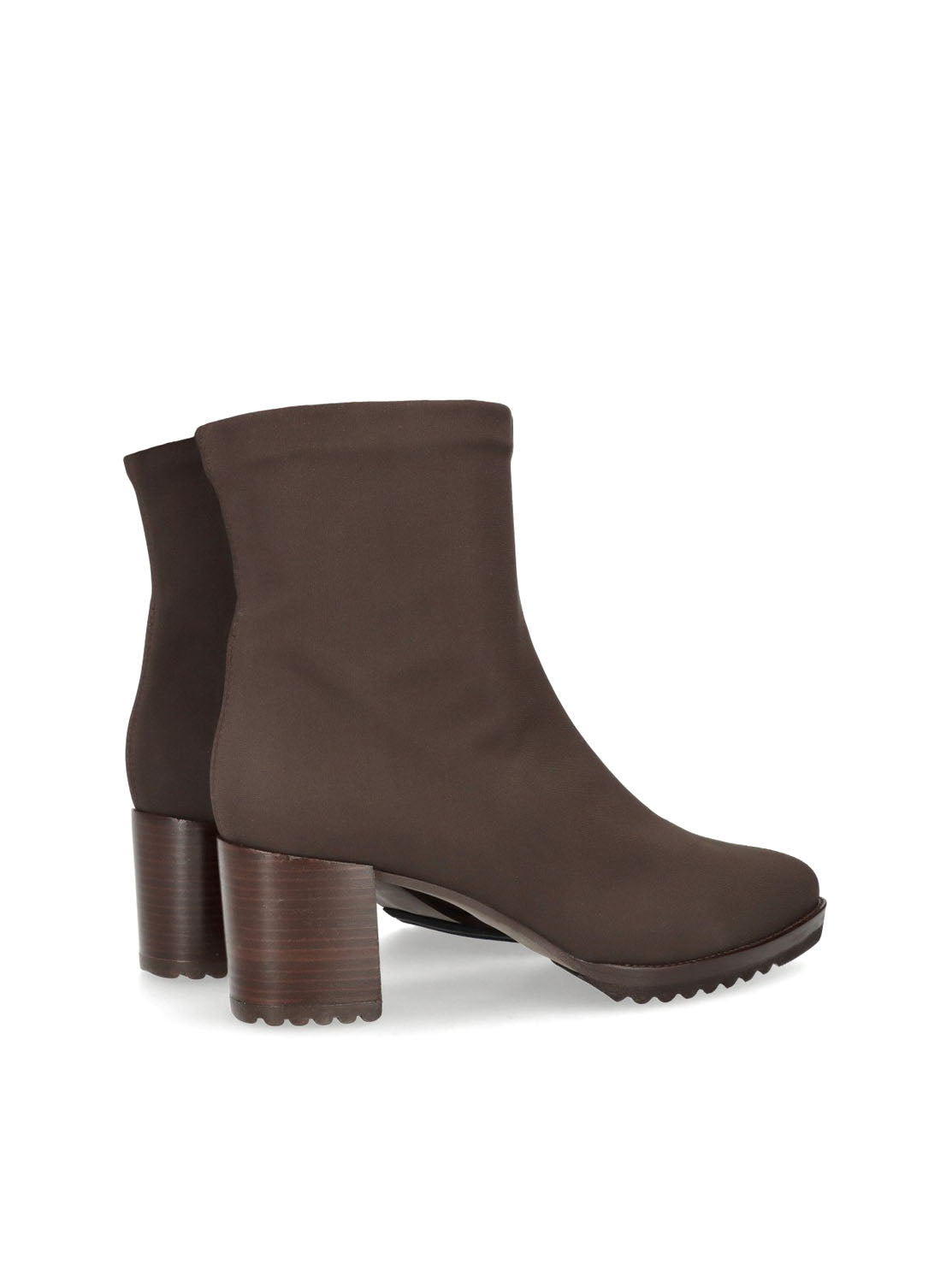 Botín modelo Cindy en tela elástica marrón chocolate resistente al agua con tacón de 6cm, suela de goma, plantilla de piel y forro de tela.