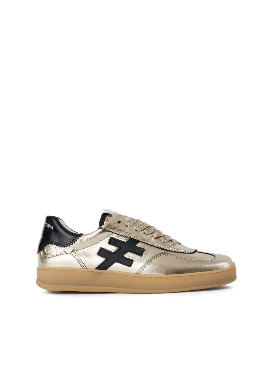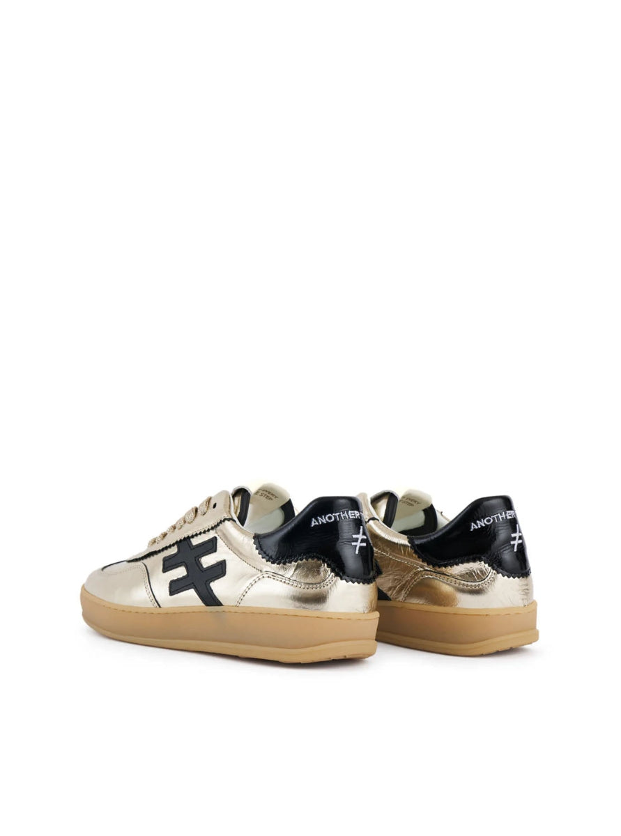 Deportivo, estilo retro, fabricado en piel metalizada de color platino. Logotipo lateral y refuerzo trasero combinados en piel negra. Puntera ligeramente redondeada y suela de goma a tono.