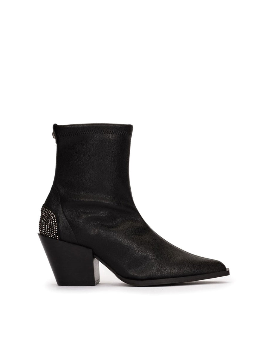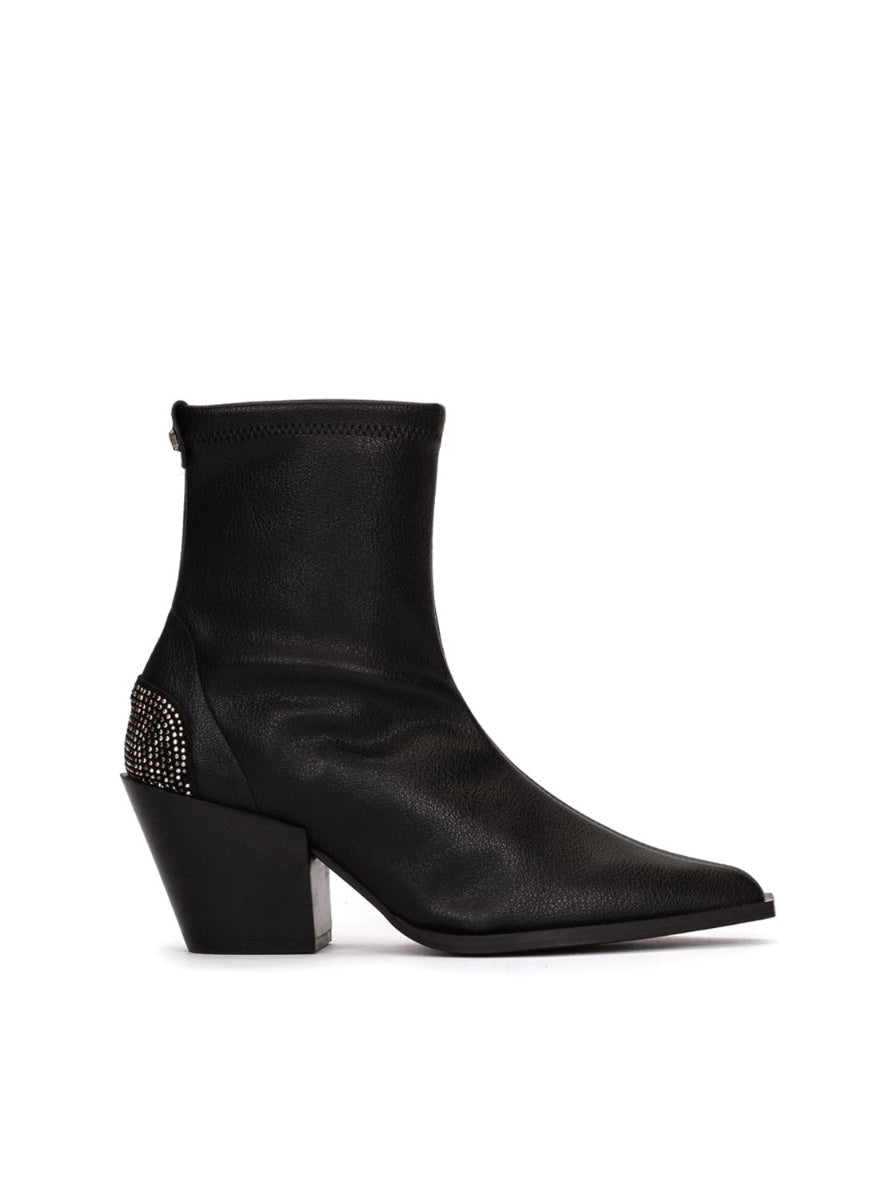 Botines de tejido elástico efecto piel de color negro. Un diseño que combina su silueta estilo cowboy con el detalle sofisticado de los brillos. El tejido elástico se adapta al pie y permite un movimiento ligero y cómodo. La opción ideal para lucir durante horas.