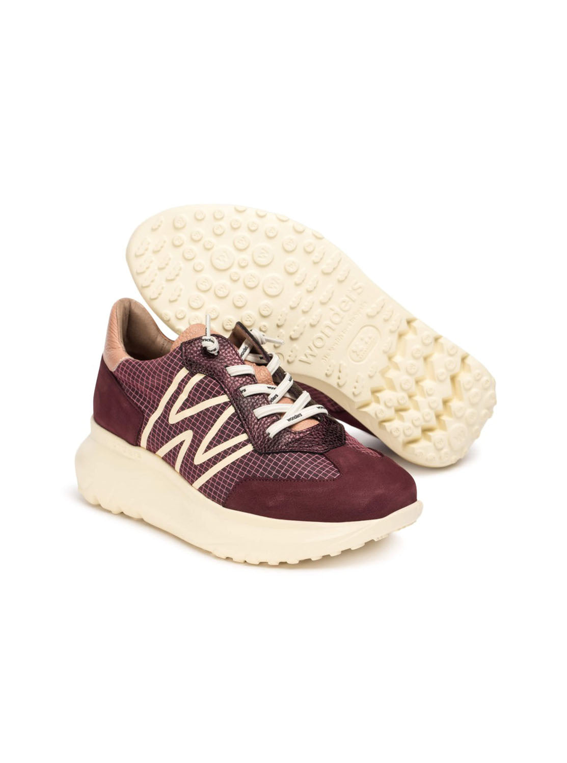 Deportivas ULTRAFLY 01 confeccionadas en una combinación de piel y textil en color burdeos. Inspiradas en el estilo running, ofrecen el equilibrio perfecto entre deportividad y moda. Destacan la “W” estampada en el lateral exterior y su cierre mediante cordón elástico para un ajuste ideal. Su suela, creada con tecnología WondersFly™ by XL EXTRALIGHT®, garantiza una ligereza excepcional y un confort extraordinario. Además, la plantilla interior extraíble de MemoryGel se adapta perfectamente al pie, proporcionando comodidad en cada paso.
