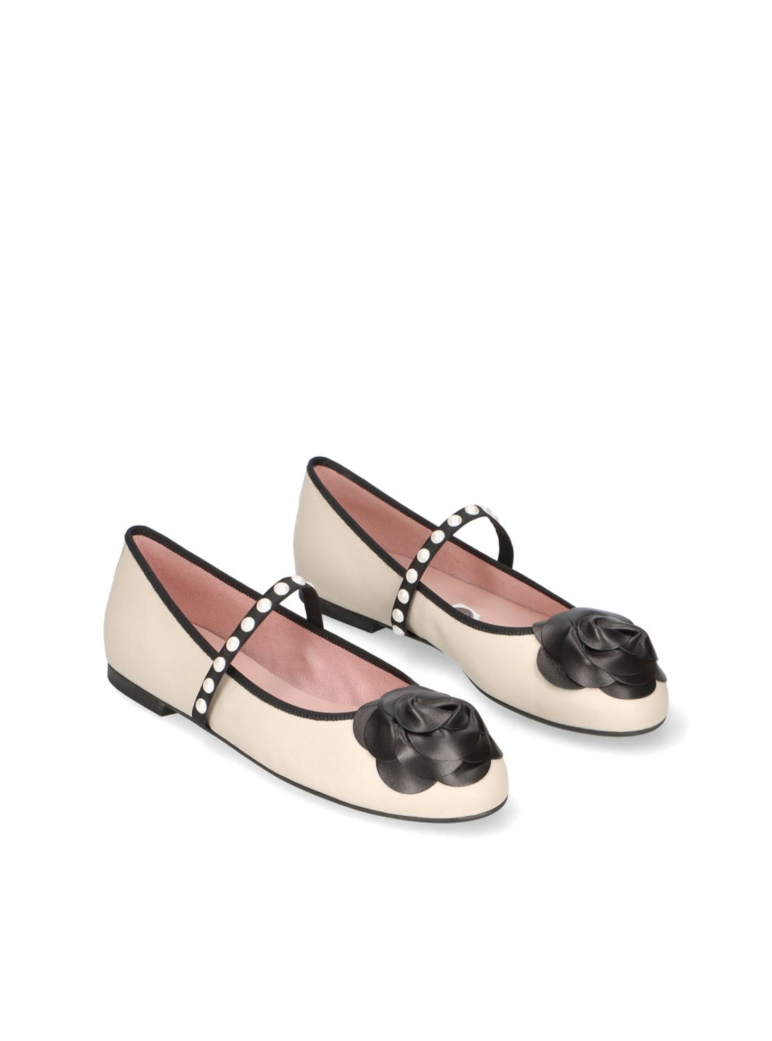 Bailarina modelo Nicole en napa suave color beige con flor XL de napa negra hecha a mano y elástico cubierto de cristales Swarovski sobre el empeine. Suela de goma, plantilla de piel y forro de tela.