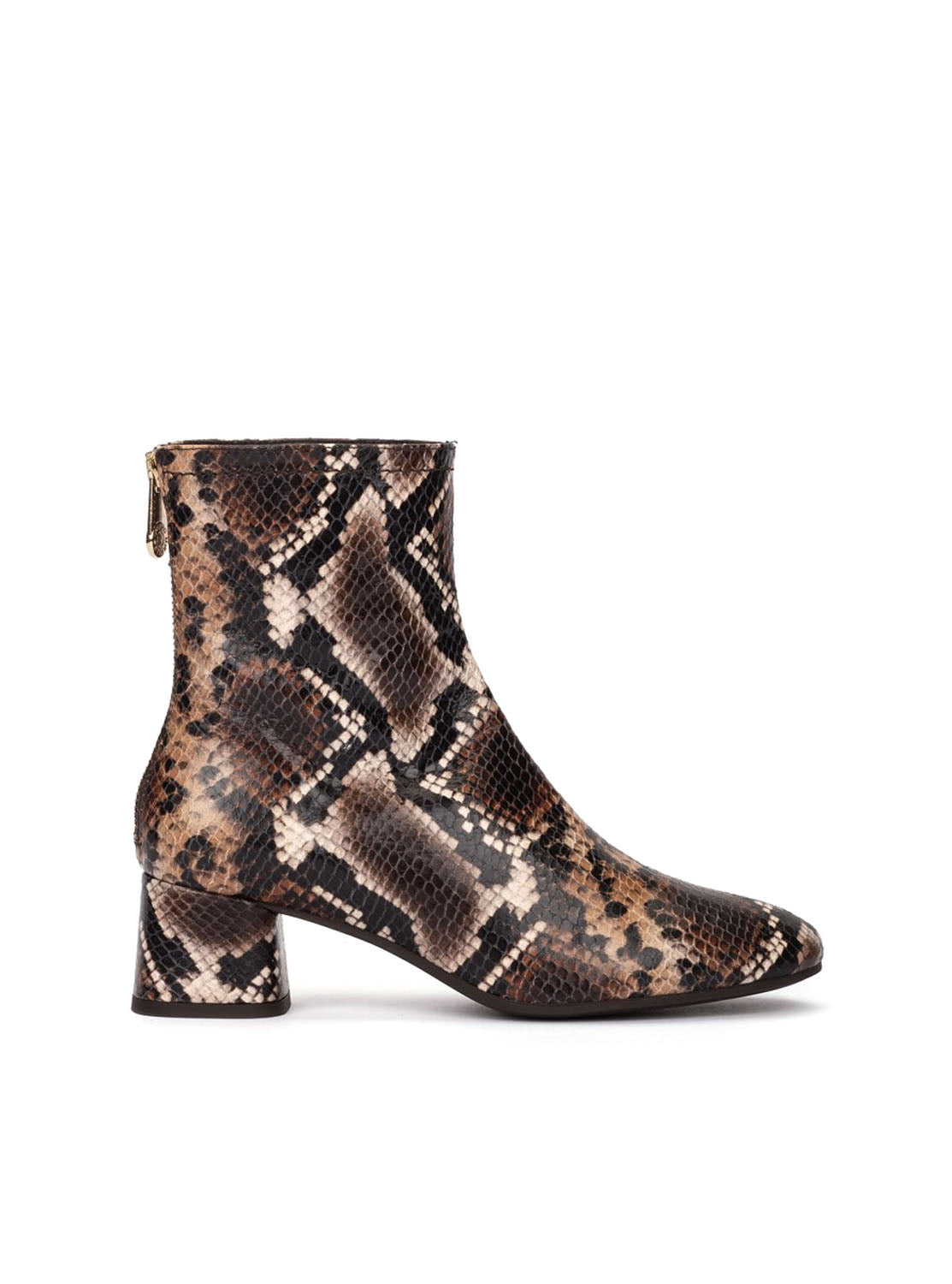 Botines de piel con estampado de serpiente marrón. Un botín clásico y muy versátil con un toque innovador gracias a su tacón redondo. Cuenta con cremallera trasera. ¡Será el modelo perfecto para combinar con todos tus looks!