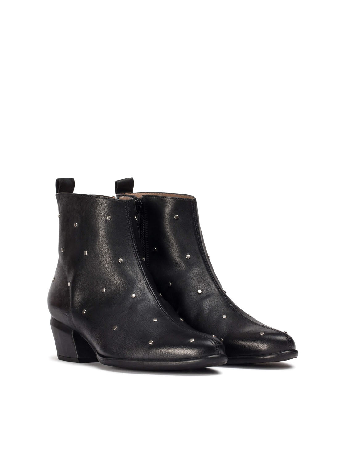 Botines FEI 02 confeccionados en piel negra con microtachas metálicas distribuidas por todo el empeine. Un diseño minimalista con inspiración western que combina líneas depuradas y una silueta estilizada con toques de carácter gracias a los detalles metálicos. Incorpora cremallera lateral interior para un ajuste cómodo y funcional, y tiradores en ambos talones del caño que refuerzan su estética urbana. El tacón de altura media aporta estabilidad sin renunciar a la sofisticación. La suela de goma flexible aporta un extra de comodidad, combinado con la plantilla interior de MemoryGel que asegura una pisada amortiguada en cada paso.