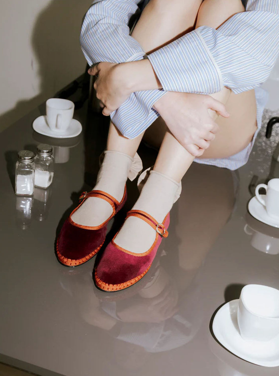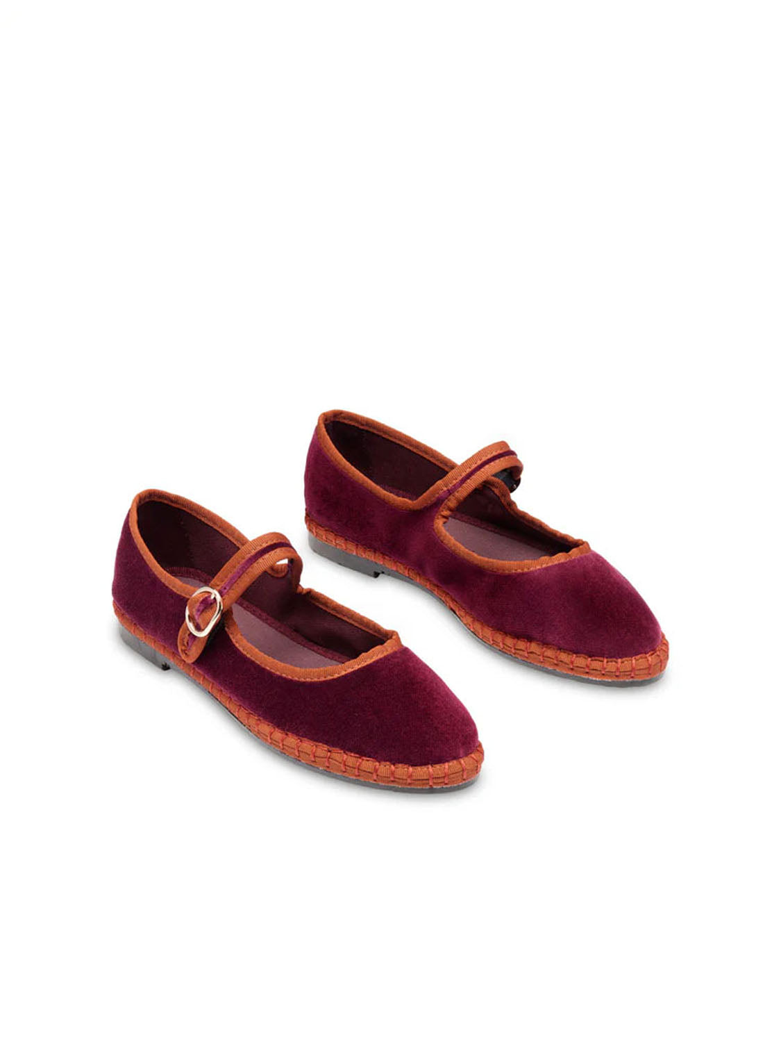 Mary jane de terciopelo en burdeos con ribete naranja oscuro y cierre de hebilla. El exterior del zapato es 100% terciopelo de algodón, y el interior es 100% algodón orgánico con tratamiento antibacteriano.